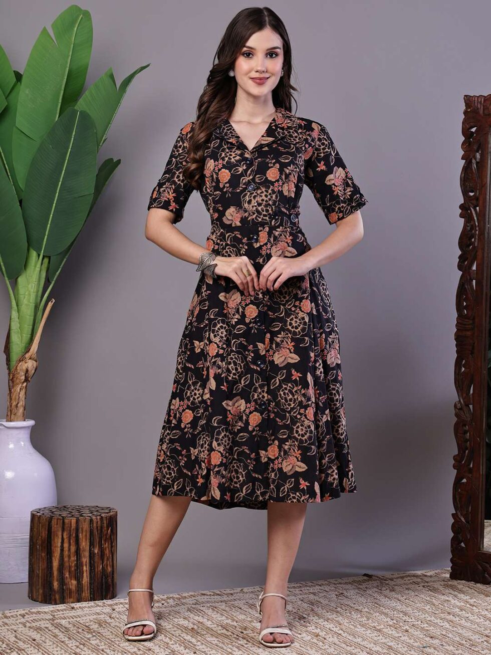 Be the first to review “Women’s Chic Black & Rust Floral Print Button-Front Midi Dress”